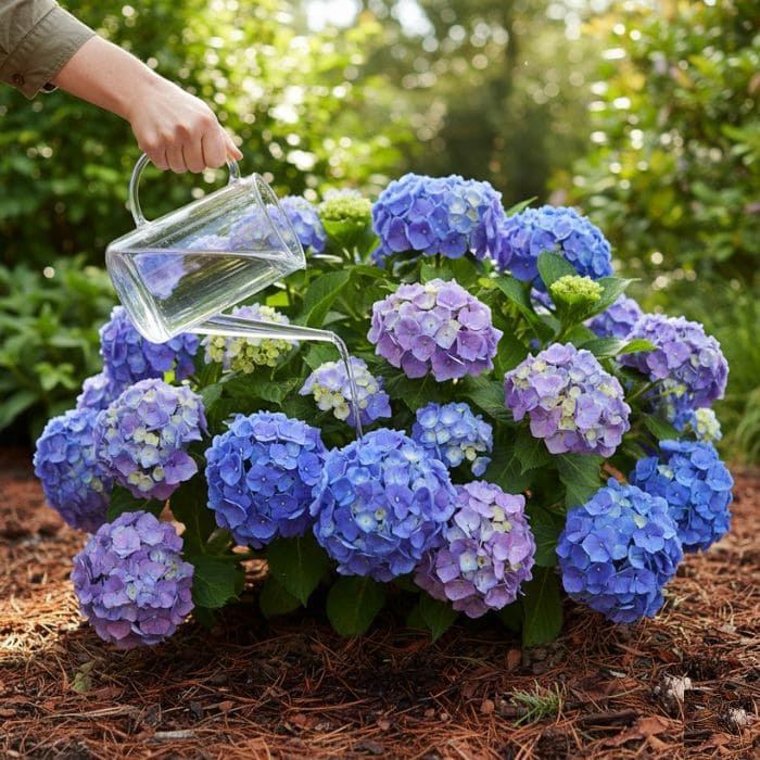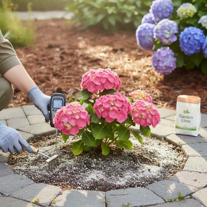 To raise the soil pH and encourage pink blooms, I added garden lime in measured amounts, mixing it gently into the top layer of soil and watering thoroughly.