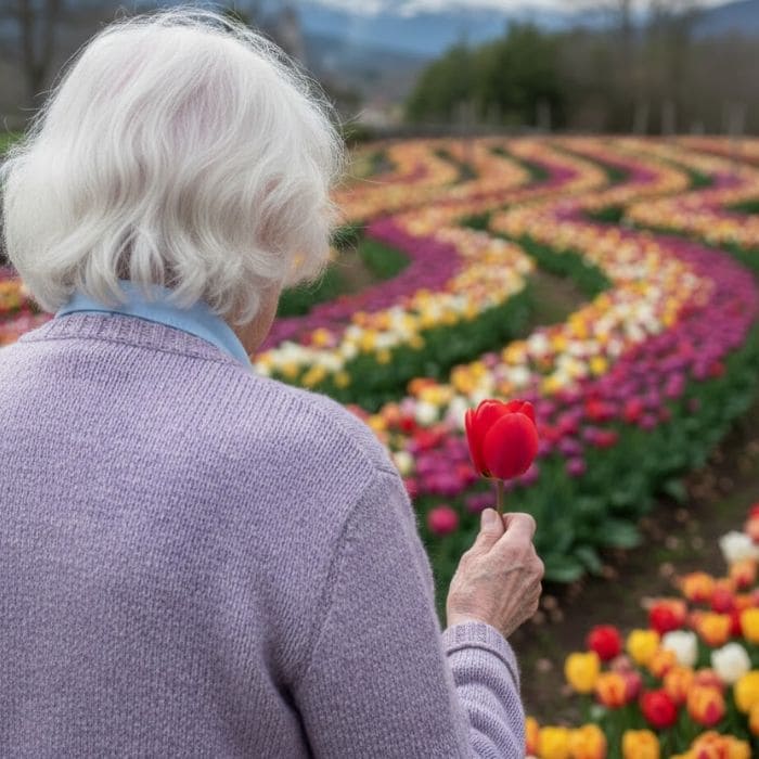 She stopped near the center, bent slightly, and touched the side of one tulip with her fingers. She did not pick it. She did not straighten it. She just touched it.