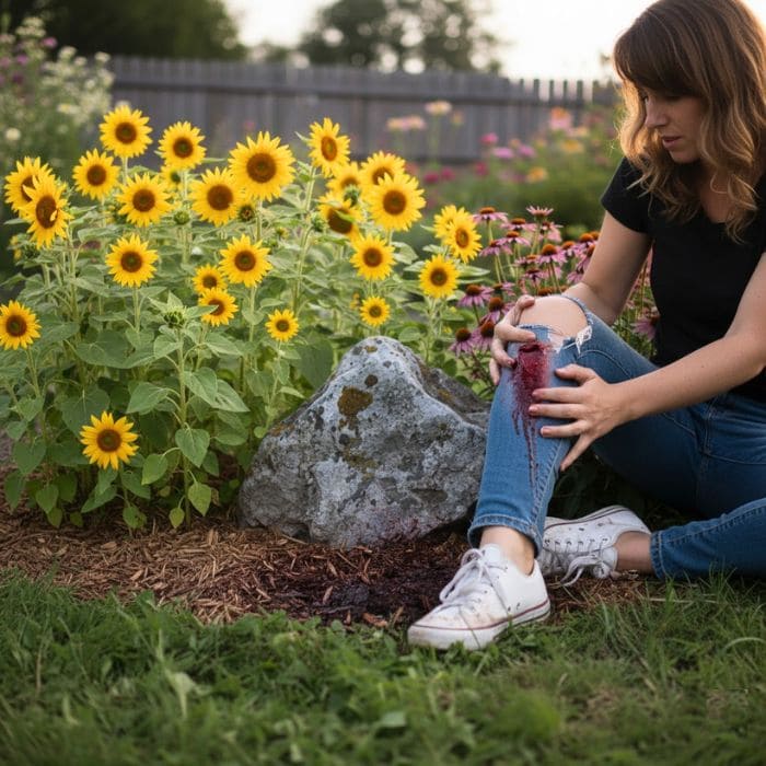 The pain was sharp and immediate, the kind that takes your breath away before you have time to react. I felt heat, then a deep sting, and when I looked down, blood was already flowing. It was darker than I expected, running slowly over my knee and soaking into the soil beneath me.