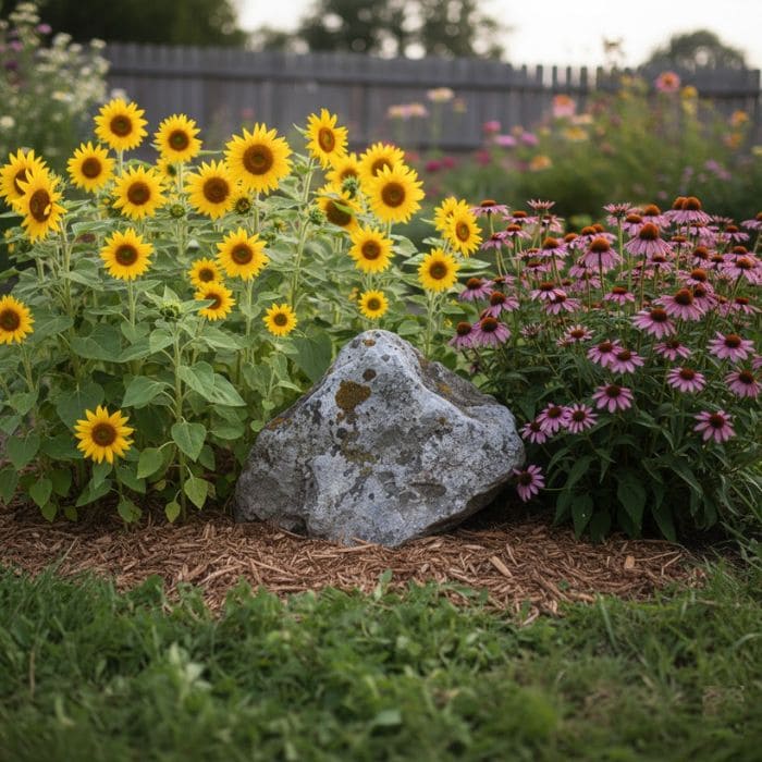 A few days earlier, I had placed a medium-sized rock in the garden as a temporary marker. I wanted to divide one section into two parts, one for sunflowers and one for coneflowers, but I had not finished the work yet.